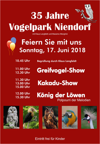 Die großen und kleine Gäste erlebten ein vielfältiges Programm mit verschiedenen Vogel-Shows. Sausten die großen Greifvögel wie Adler und Rabe bei der Greifvogel-Show über die Köpfe der Besucher hinweg, so konnten sie sich bei der Kakadu-Show an den akrobatischen Leistungen dieser Vögel erfreuen. Musikalisch ging es bei "König der Löwen - Potpurri der Melodien" zu. Zwei Hamburger Künstler bereiteten hier viel Vergnügen mit Gesängen aus den bekanntesten und beliebtesten Musicals.